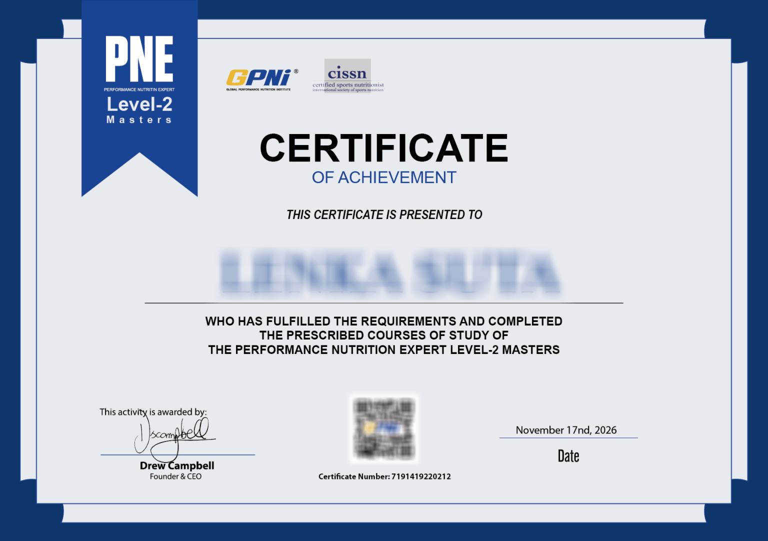 "The CISSN Level-2 Masters ISSN certification and course by the GPNi® is for those that really want to position themselves at the top level in sports and professional athlete nutrition. Boost your knowledge, qualification, and career". Drew Campbell CEO & Founder of GPNi® / CISSN